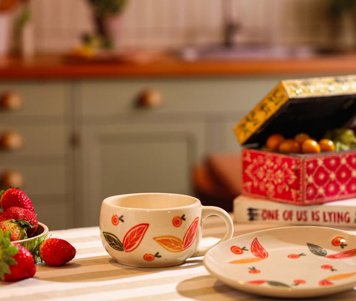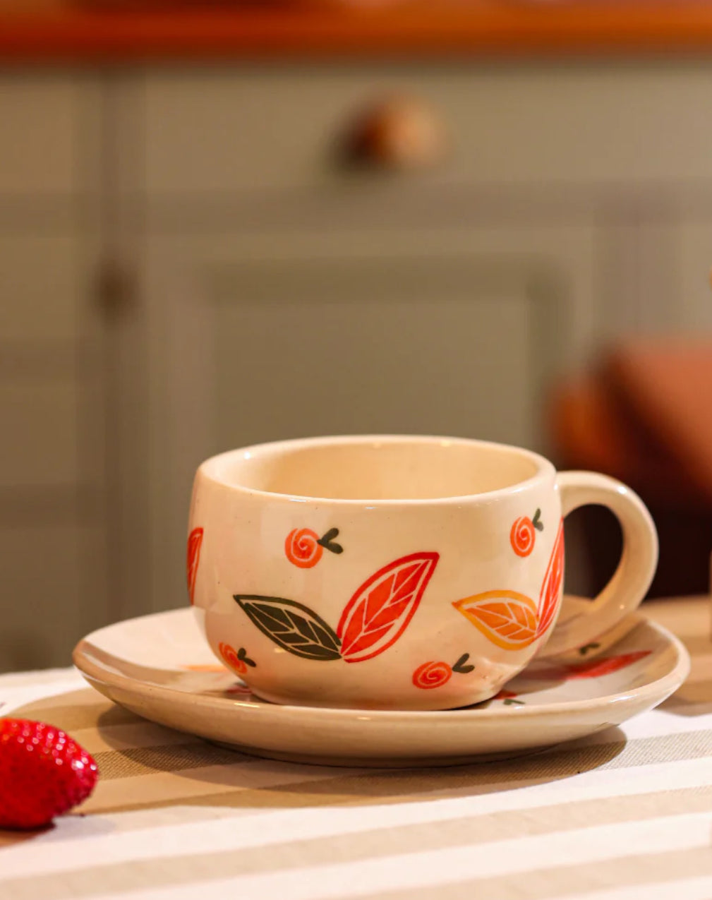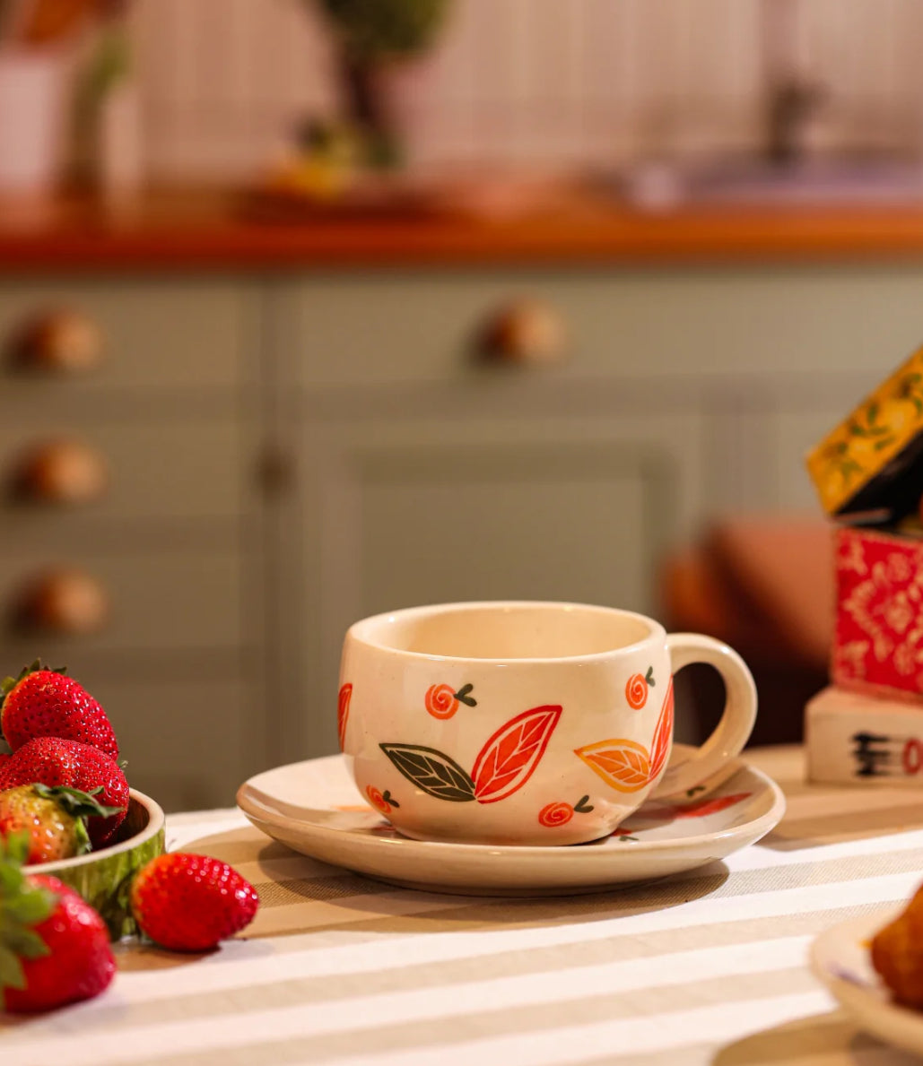 Celebrate the beauty of nature with the Autumn Whispers Ceramic Cup & Saucer. Adorned with hand-painted leaves and delicate swirls in warm, earthy tones, this cup brings the cozy essence of fall to your sipping moments. Crafted from high-quality ceramic, its smooth finish and comfortable handle make it perfect for enjoying your favorite coffee, tea, or hot cocoa. The matching saucer adds an elegant touch, making it a must-have for your collection or a thoughtful gift for a loved one.