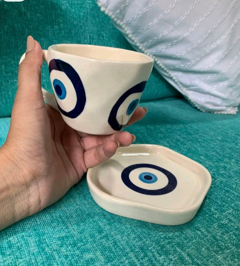 Infuse your mornings with a touch of mystique and protection. Our Evil Eye Ceramic Cup & Saucer Set is a handcrafted duo inspired by the iconic “Nazar” symbol, believed to ward off negative energy and bring good luck. With its bold concentric eye pattern in vibrant blues, this set blends boho-chic style with spiritual symbolism.