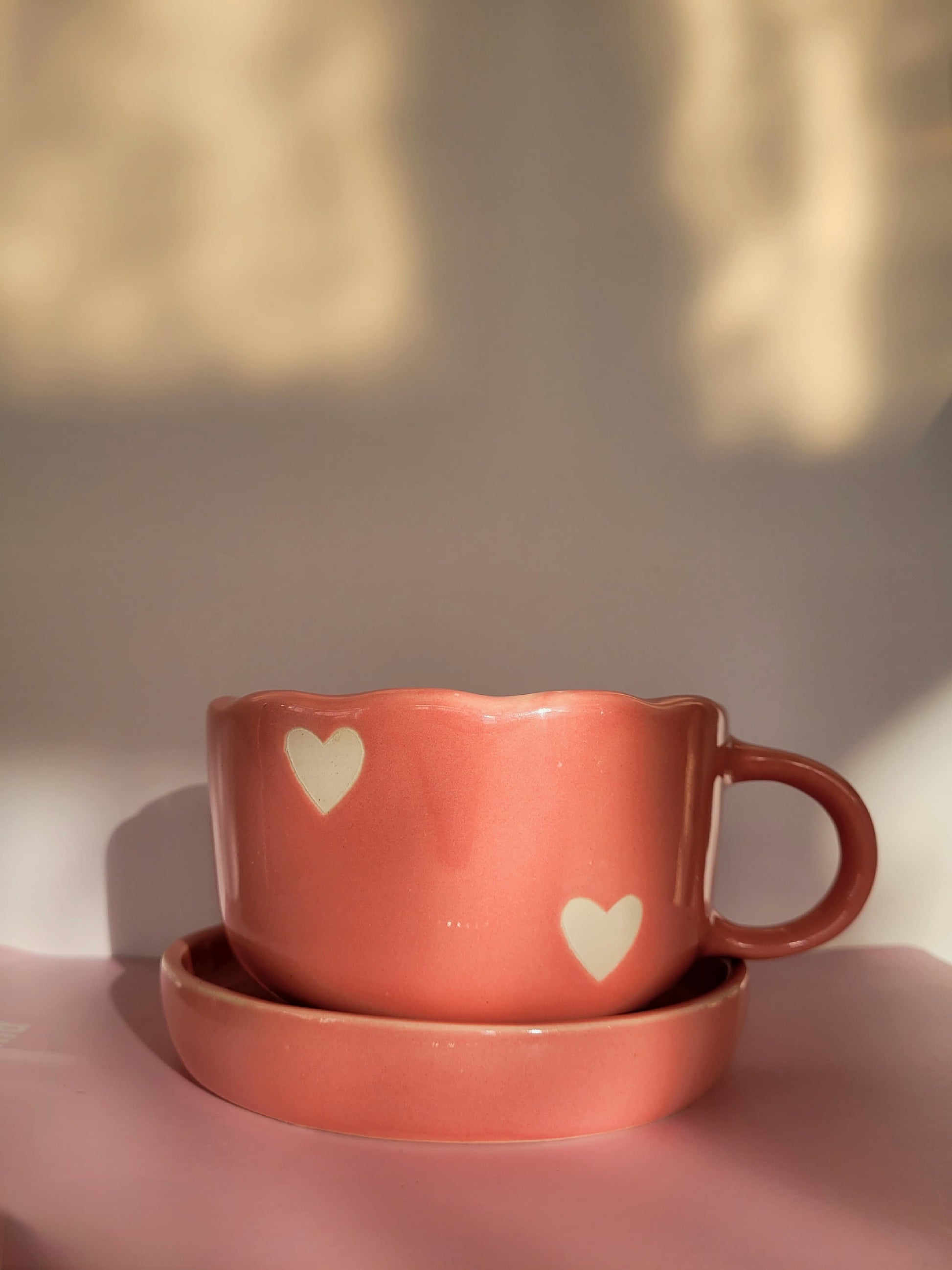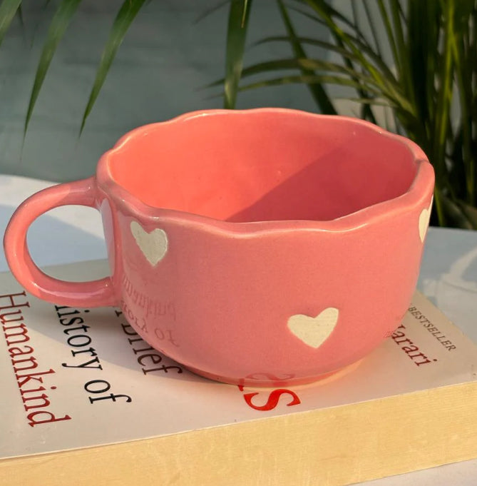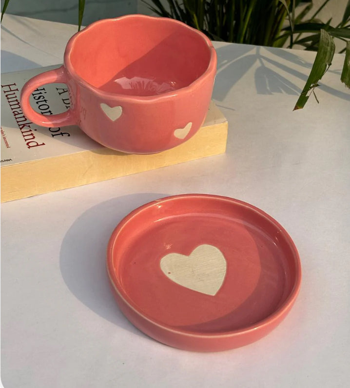 Embrace warmth and elegance with the Rose Love Mug & Saucer. This handcrafted ceramic cup, in a dreamy blush pink hue, is adorned with delicate white heart accents, symbolizing love and coziness. The unique scalloped rim adds a touch of charm, while the matching saucer completes the set with a subtle heart detail. Perfect for your morning coffee, evening tea, or a heartfelt gift, this mug is designed to make every sip feel special.